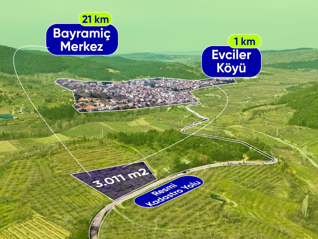 İlanını incelediğiniz bu elma bahçesi,Bayramiç ilçe merkezine 15 km mesafede yer alan Evciler'de,kazdağının eteklerinde bulunmaktadır.Evciler köyü;serin havası,temiz su kaynakları ve verimli toprak yapısıyla öne çıkmaktadır.