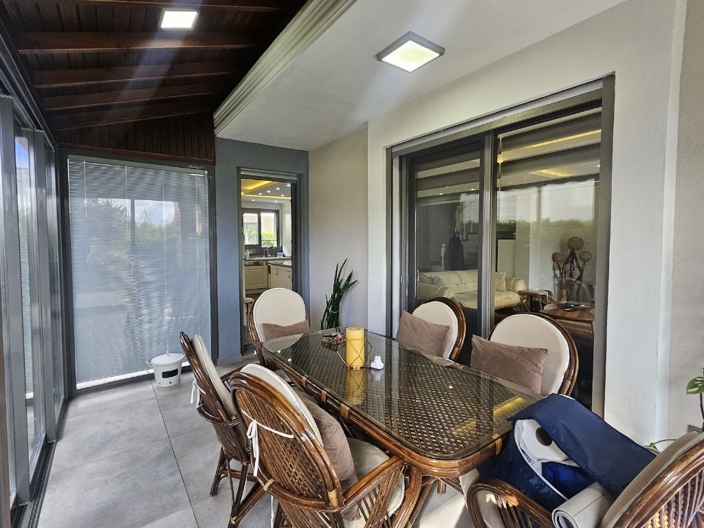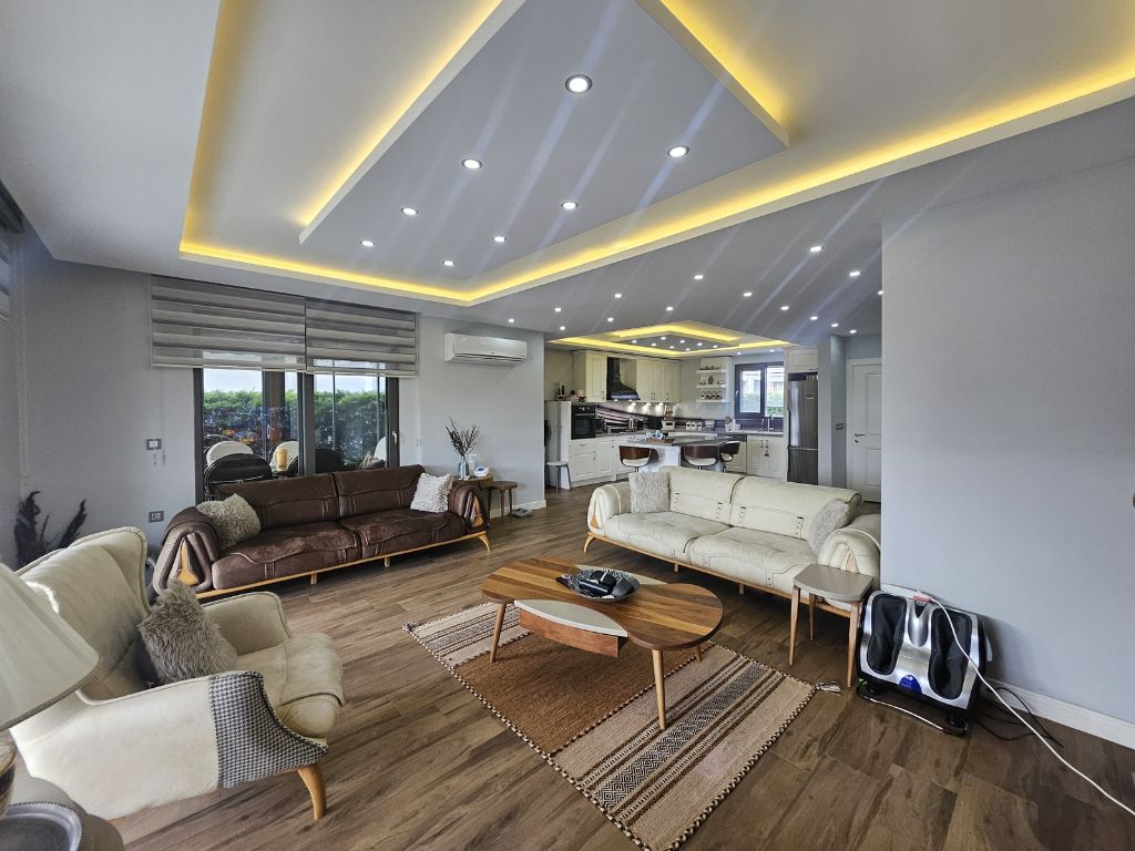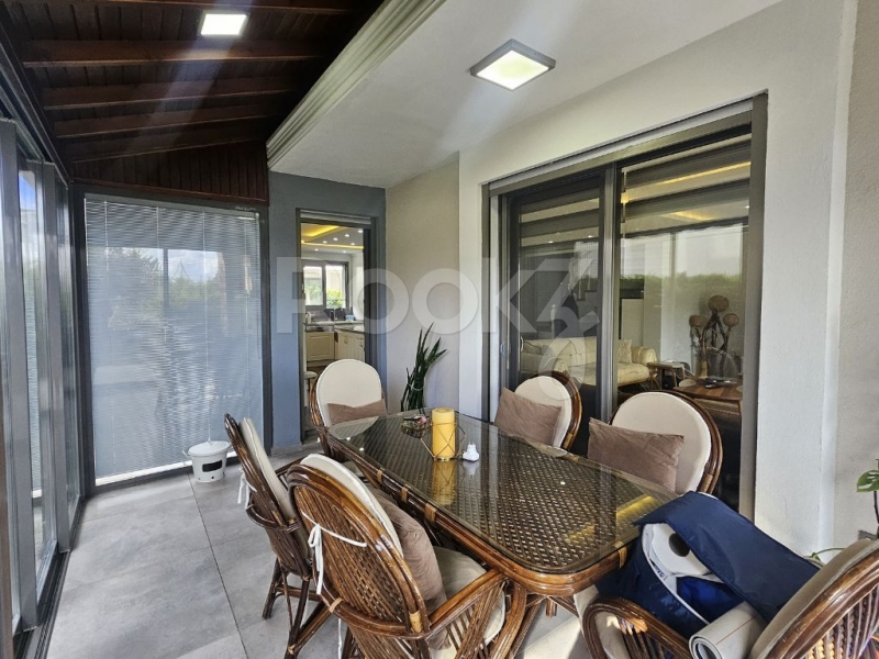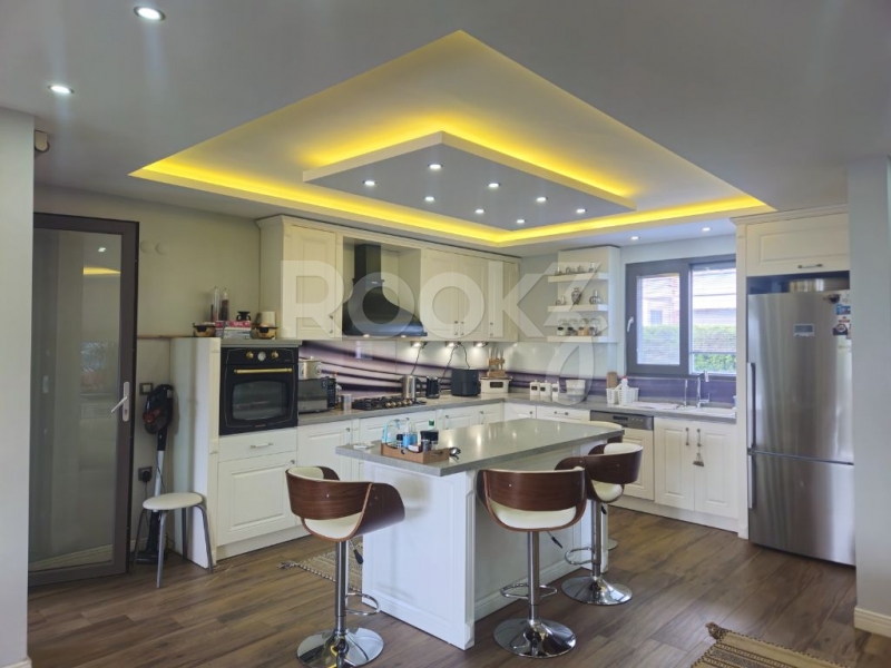 Geniş salon–mutfak alanı, adalı Amerikan mutfak tasarımıyla hem görsel hem fonksiyonel bir kullanım sunarken; kış bahçesi alanı, dört mevsim boyunca evin en keyifli yaşam noktalarından biri haline gelmektedir.